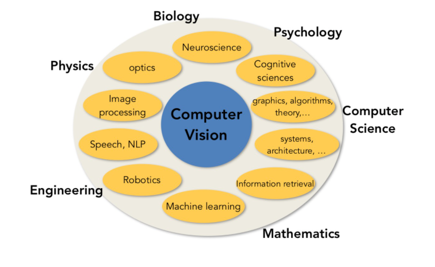 위의 그림에서 볼 수 있는 것과 같이 Computer Vision은 다양한 분야와 관련되어있다.