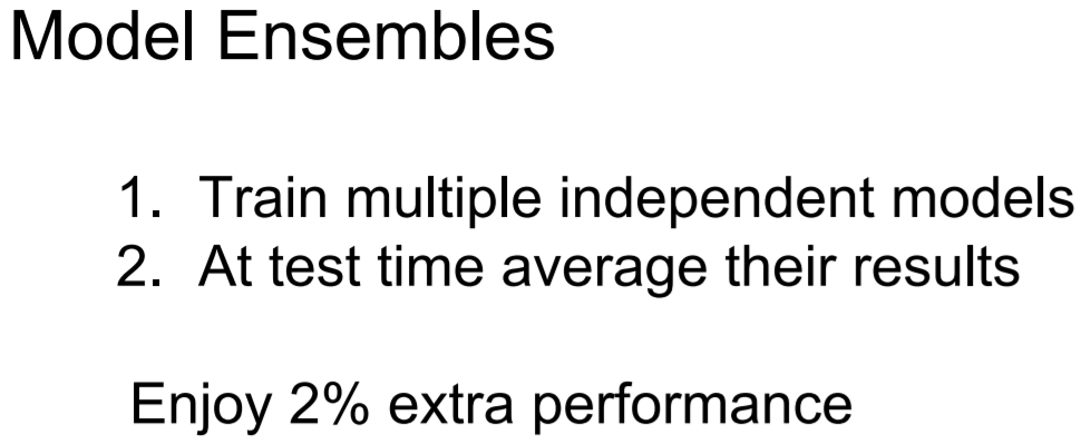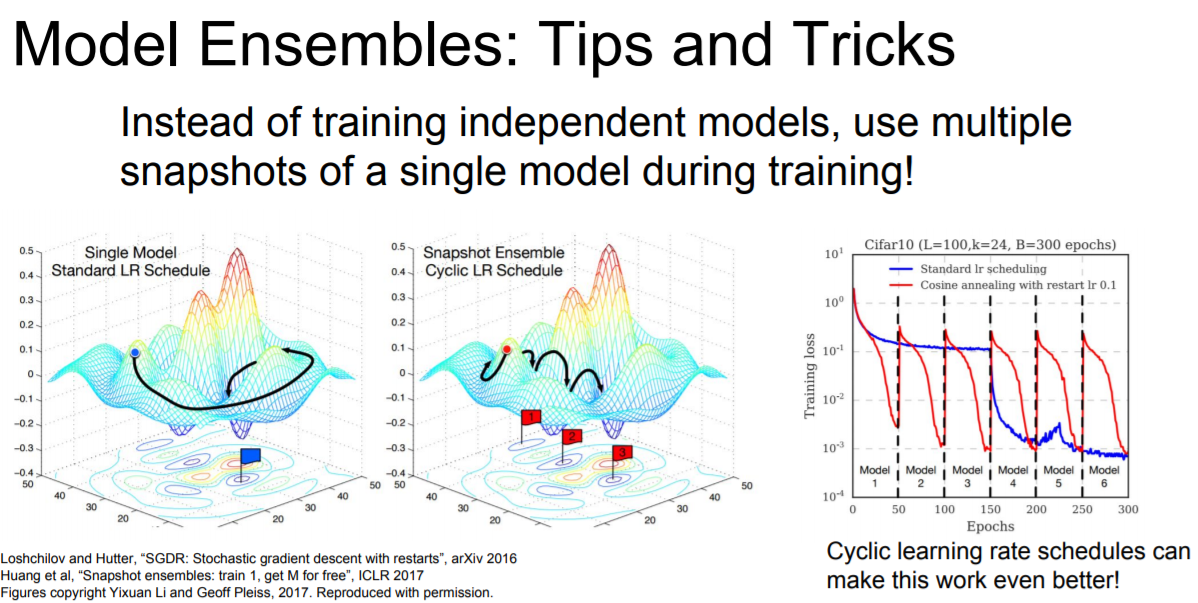 다른 방법으로 모델을 독립적으로 학습시키는게 아니라 학습 도중 중간 모델들을 저장(snapshot)하고 앙상블로 사용할 수 있다고 한다. 그리고 test때에는 여러 snapshots에서 나온 예측값들을 평균을 내서 사용한다.