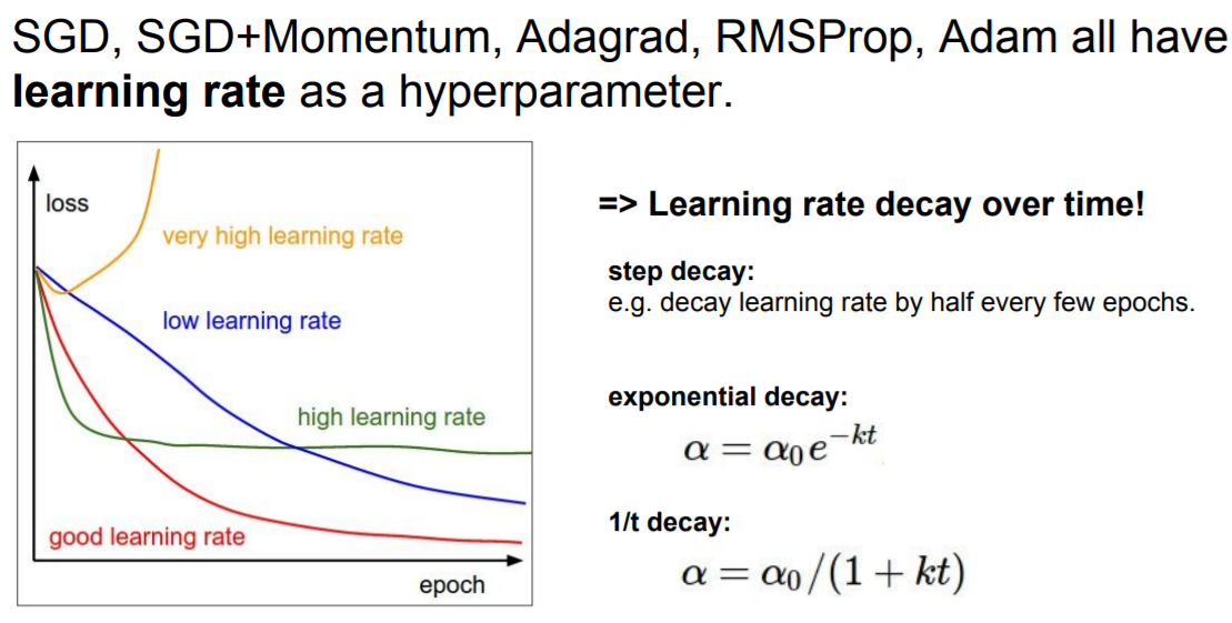 Decay learning rate 같은 경우 처음에 learning rate를 높게 설정하고 학습이 진행될수록 점점 낮추는 것이다.