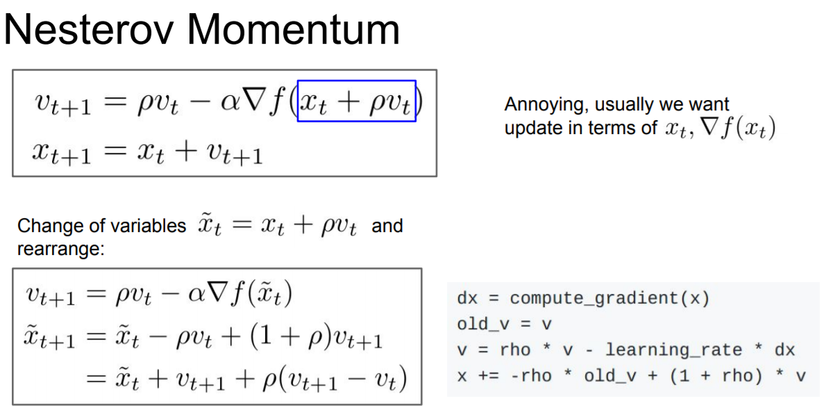 파란색 부분이 뜻하는 것은 미리 velocity 방향을 예측해서 gradient를 구해준다는 의미이다.