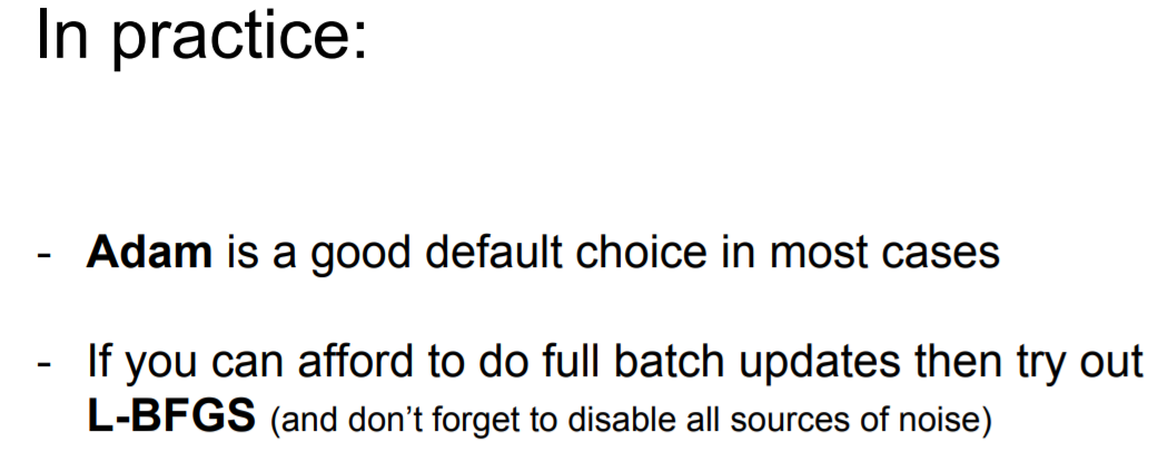 Adam이 가장 좋은 선택이고, full batch이라면 L-BFGS도 좋은 선택이 될 수도 있다.