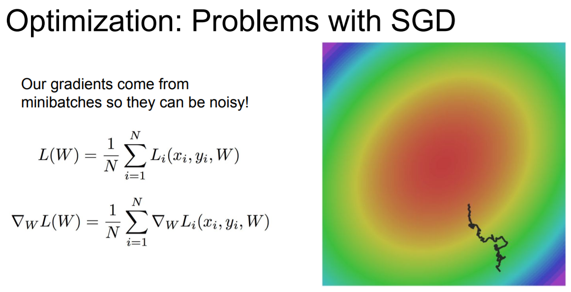 미니배치를 가지고 업데이트 하는데, 이는 매번 정확한 gradient를 얻을 수가 없다는 것을 의미한다.