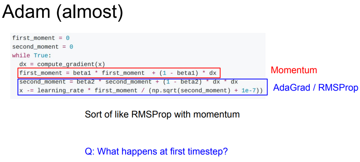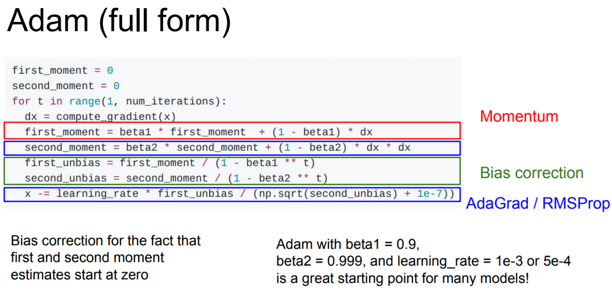 식을 보면 first_moment와 second_moment가 0이다. 근데 second_moment를 1회 update하고 났을 때 beta2는 decay_rate이니까 0.9 또는 0.99로 1에 가까운 수이다. 그렇기 때문에 1회 update 이후에 second moment는 여전히 0에 가깝다. 이후 update step에서 second_moment로 나누게 되는데 나눠주는 값이 작다보니까 분자가 커져서 값이 튈 수도 있다고 한다. 값이 크면 step이 커져서 이상한 곳으로 튀어버릴 수도 있다.