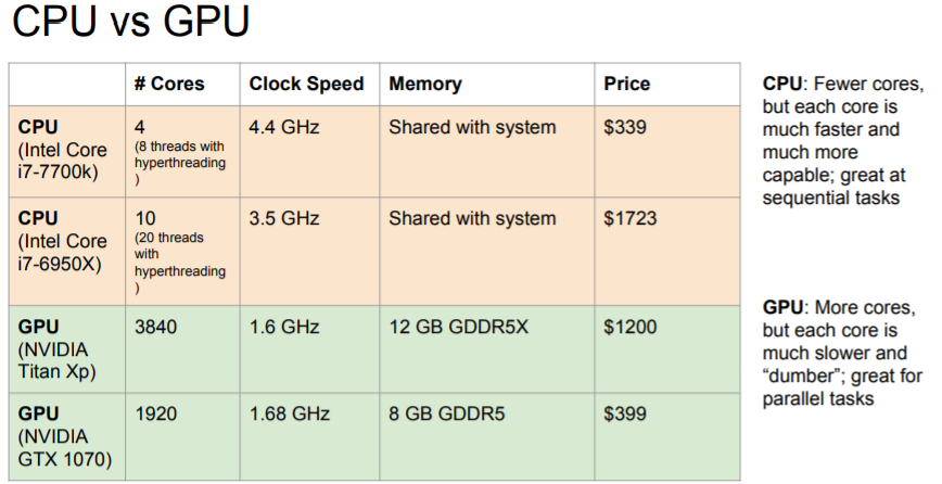 더 많은 core로 일을 병렬적으로 수행하고 싶을 때 GPU가 자주 쓰인다.