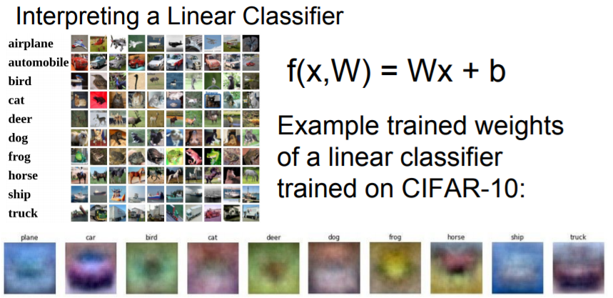 가중치 행렬 W의 각 행은 각 이미지에 대한 '템플릿'으로 볼 수 있고,