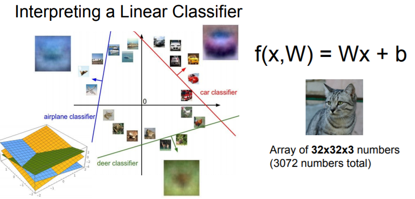 Linear classifier는 각 클래스를 구분시켜주는 선형 결정 경계를 그어주는 역할을 하게되는 것이다.