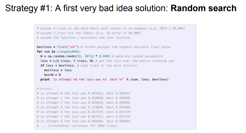 임의로 샘플링한 W들을 엄청 많이 모아놓고 Loss를 계산해서