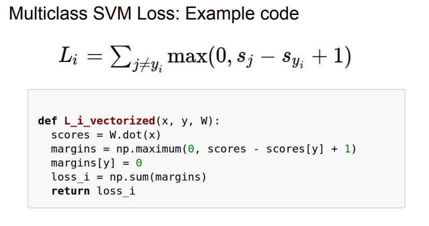 위 코드는 Multiclass SVM Loss를 코드화 시킨 것이다.